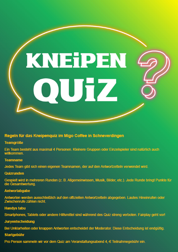 Ihr seid klüger als der Stammtisch? Dann stellt euch der Herausforderung: Das Kneipenquiz kommt nach Schneverdingen! Gemeinsam rätseln, lachen und das eigene Wissen testen – mitten im gemütlichen Migo Coffee.